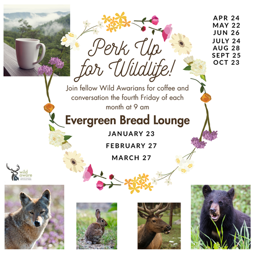 Wild Aware, an Evergreen Colorado non-profit organization, is actively recruiting volunteers, new and old, for their Fourth Friday Coffee, a monthly event that continues on the 4th Friday morning of every month. Our gatherings begin at 9:00 am in the Evergreen Bread and Cocktail Lounge, 1260 Bergen Pkwy, Evergreen, CO 80439. Come meet new friends and make an impact in your community!